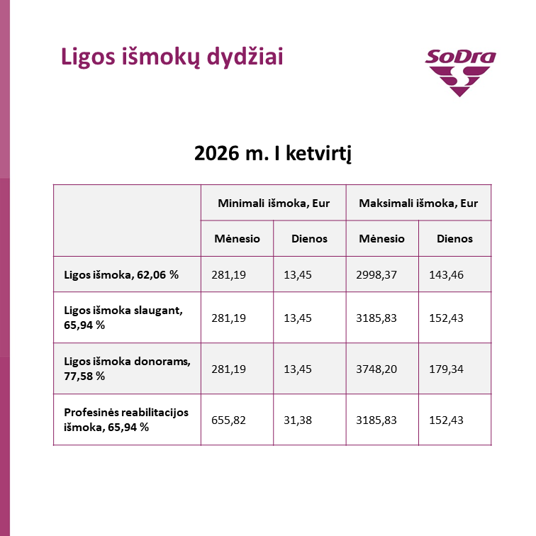 Pirmojo 2026 metų ketvirčio ligos išmokos bus apskaičiuojamos taikant 2 415,70 euro VDU dydį, kuris galiojo trečiąjį 2025 m. ketvirtį.