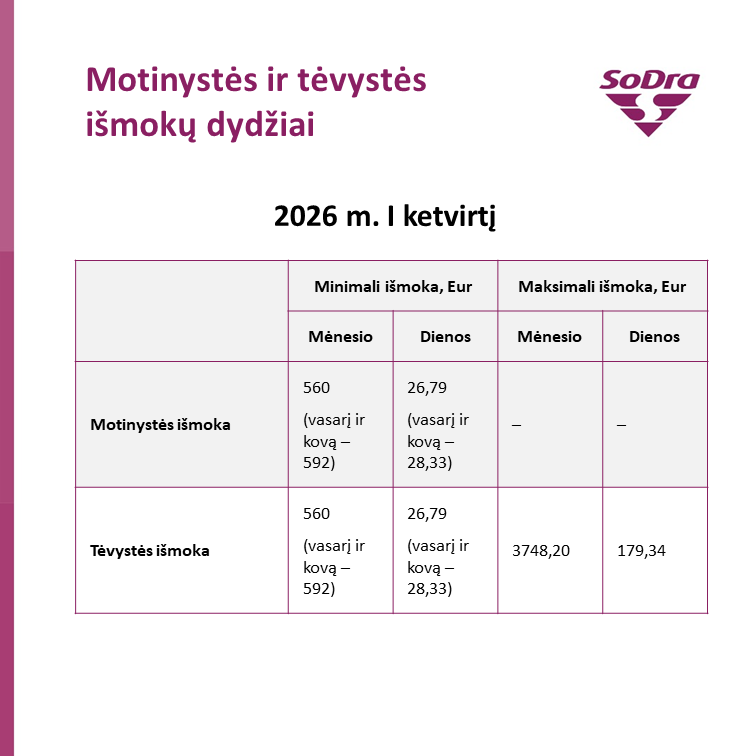 2026 metais bazinė socialinė išmoka didės nuo 70 iki 74 eurų. Todėl asmenims, kurie teisę į motinystės, tėvystės ar vaiko priežiūros išmoką įgis iki sausio 31 d., minimali išmoka sieks 560 eurų. Jei teisė atsiras vasarį arba kovą, minimali išmoka bus didesnė – 592 eurai.