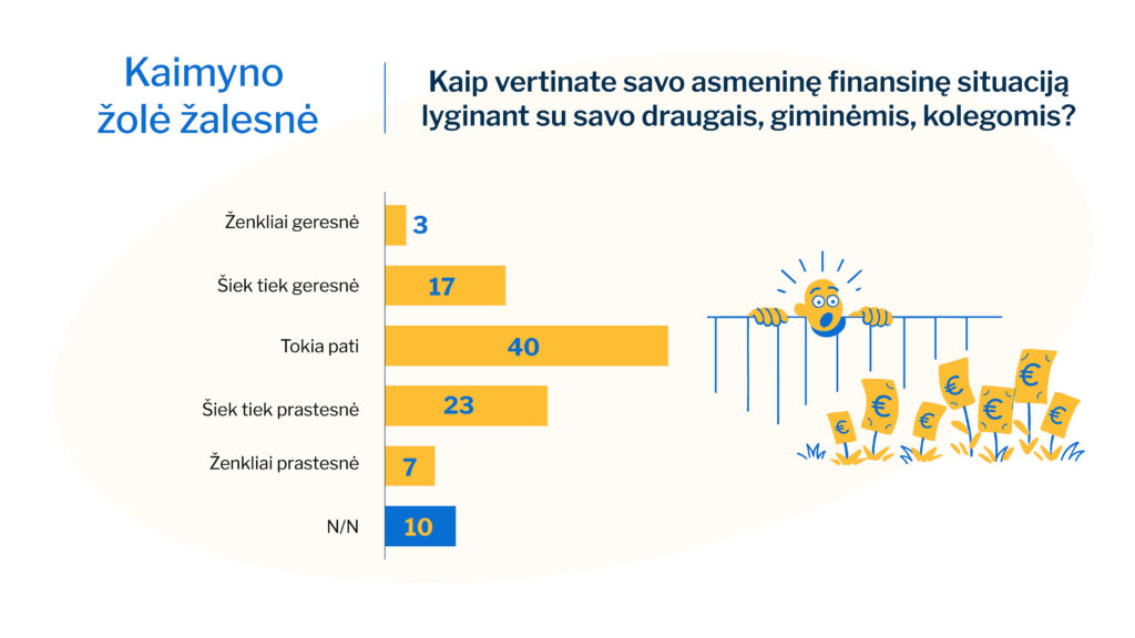 Kaip parodė tyrimas, tik 20 proc. apklaustųjų mano, kad jų asmeninė finansinė situacija yra geresnė nei draugų ar kolegų. Tuo tarpu beveik kas trečias gyventojas (30 proc.) yra įsitikinęs, kad gyvena prasčiau už kitus.