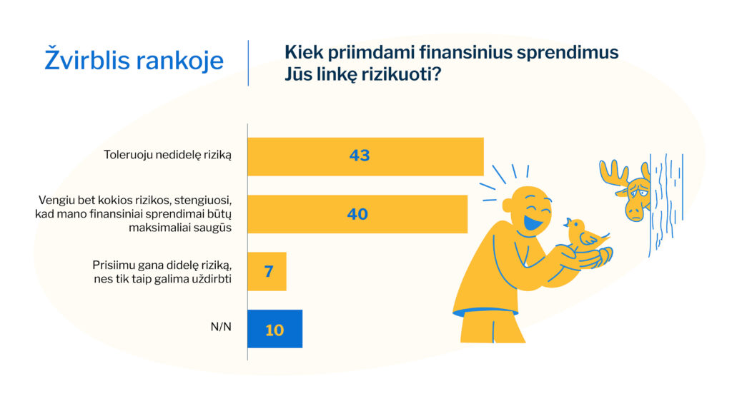 Net 83 proc. gyventojų priimdami finansinius sprendimus arba visiškai vengia rizikos (40 proc.), arba ją toleruoja tik minimaliai (43 proc.). Tik nedidelė visuomenės dalis (7 proc.) ryžtasi drąsesniems žingsniams investavimo ar verslo srityje.