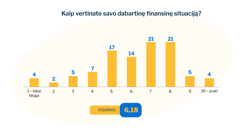 Nors pragyvenimo lygio rodikliai Lietuvoje pastaraisiais metais gerėjo, visuomenėje vis dar aiškiai jaučiamas finansinis neužtikrintumas. Atlikta reprezentatyvi gyventojų apklausa parodė, kad bendras lietuvių finansinės savijautos balas siekia vos 6,2 iš 10 – tad iki finansinės ramybės daugeliui dar toli.