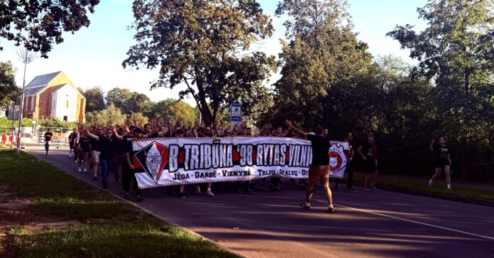 Likus valandai iki pirmųjų 2025-2026 m. LKL sezono Kėdainių „Nevėžio” rungtynių Kėdainių arenoje su Vilniaus „Rytu” miesto gatvėmis pražygiavo skanduojančių „Ryto” fanų kolona.