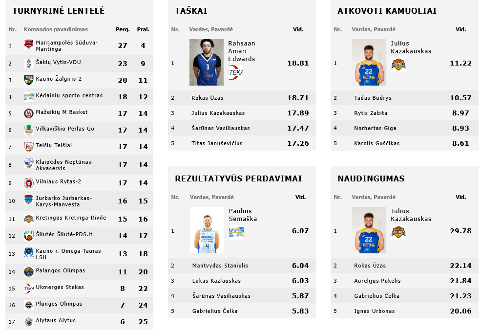 „Perlas Go“: Mantvydas Žukauskas 26 (5/9 dvit., 4/8 trit., 3 per. kam., 29 naud.), Giedrius Stankevičius 14 (6/8 dvit., 0/5 trit., 12 atk. kam.), Gabrielis Quillanas 13 (3/4 trit.), Theodore’as Gadsdenas (2/8 dvit., 7 atk. kam.) ir Žygimantas Skučas (4/8 dvit., 9 atk. kam., 6 kld.) po 9.