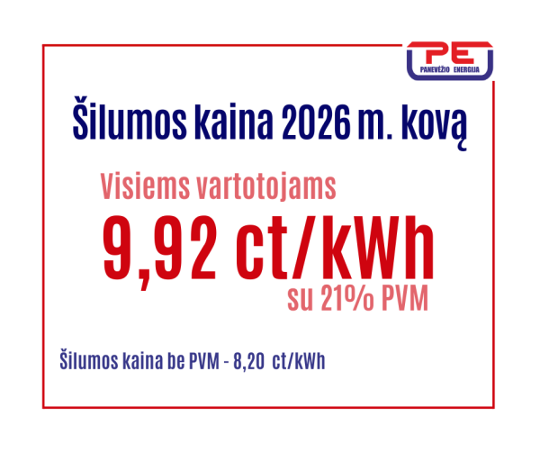 Nuo 2026 m. kovo 1 d. nustatyta AB „Panevėžio energija“ centralizuotai tiekiamos šilumos kaina už suvartotą šilumos kiekį  sudaro  8,20 ct/kWh (be PVM).  Šilumos kaina, palyginti su vasario mėnesiu, didėja 0,59 ct/kWh.