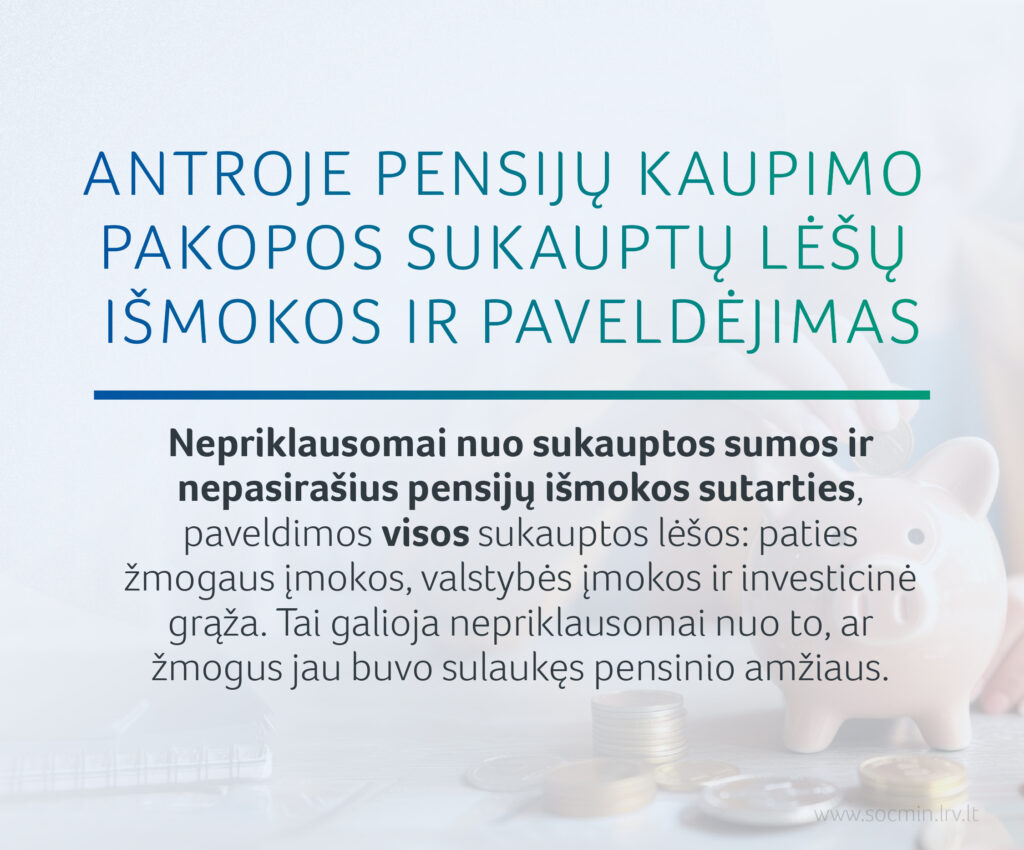 Situacija keičiasi, kai žmogus pasirašo pensijų išmokos sutartį. Tokiu atveju paveldėjimas priklauso nuo sukauptos sumos dydžio ir pasirinkto išmokos būdo.