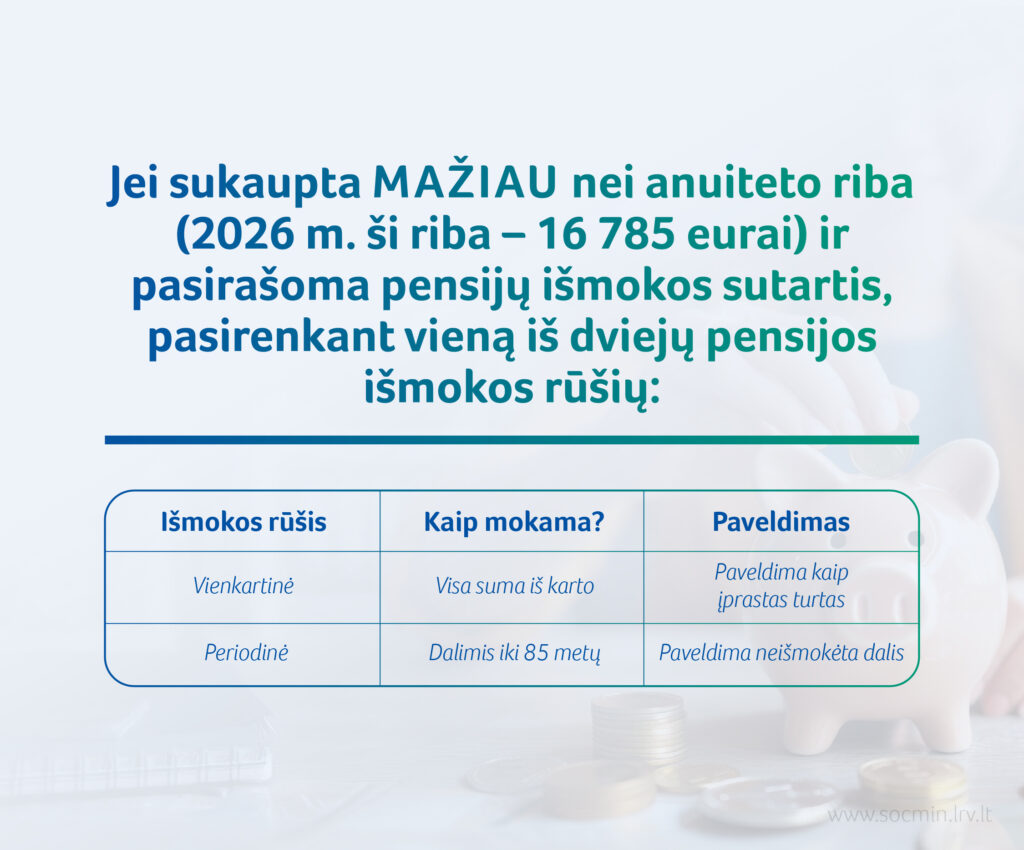 Jei sukaupta mažiau nei anuiteto riba (2026 m. ši riba – 16 785 eurai), tokiu atveju žmogus gali pasirinkti vienkartinę išmoką arba periodinę išmoką. Pasirinkus vienkartinę išmoką, visa suma išmokama iš karto. Šie pinigai tampa asmeninėmis lėšomis ir gali būti paveldimi kaip ir kitas turtas. Pasirinkus periodinę išmoką, iki 85 metų pinigai jam mokami dalimis, o jeigu žmogus miršta anksčiau, paveldėtojai gauna likusią neišmokėtą sumą. Šias išmokas moka pensijų kaupimo bendrovės.