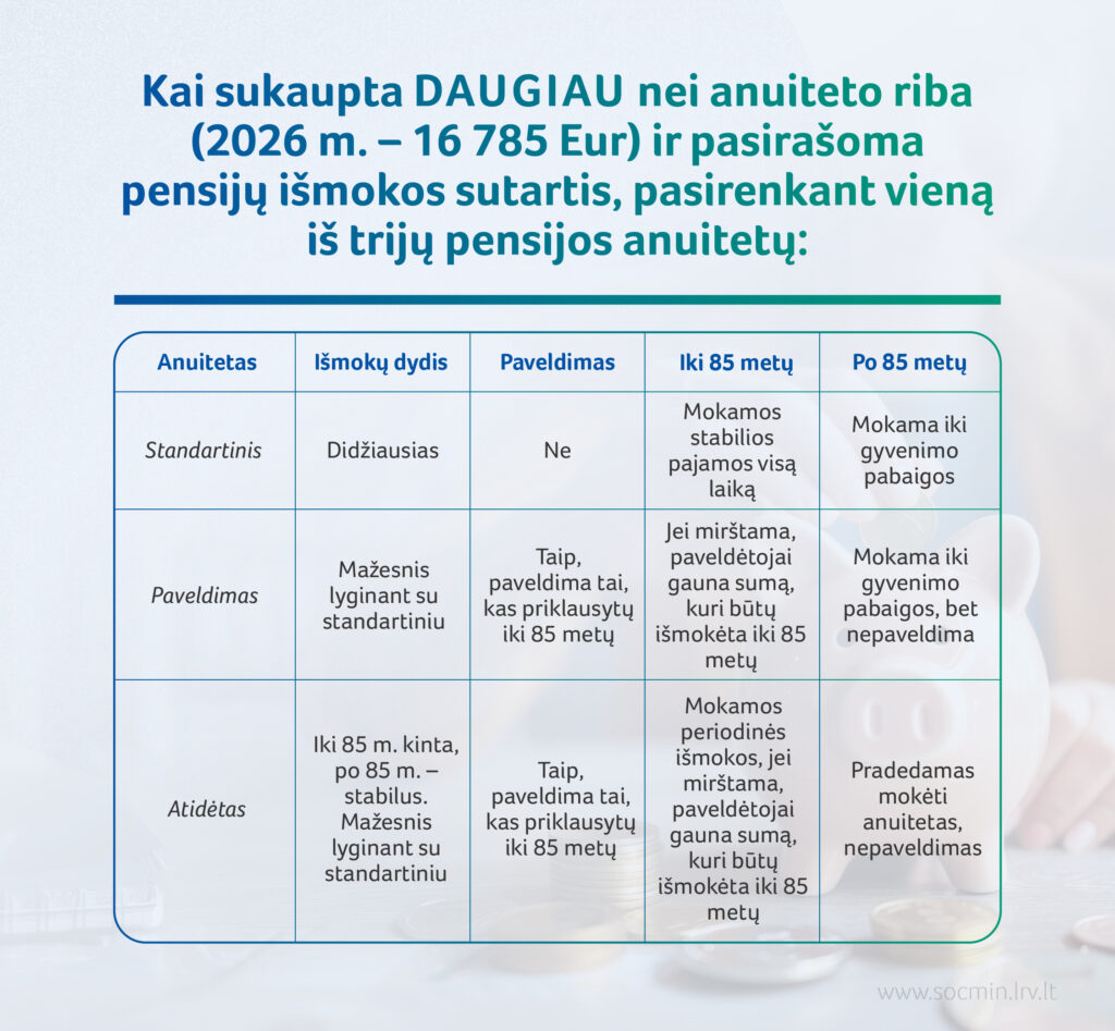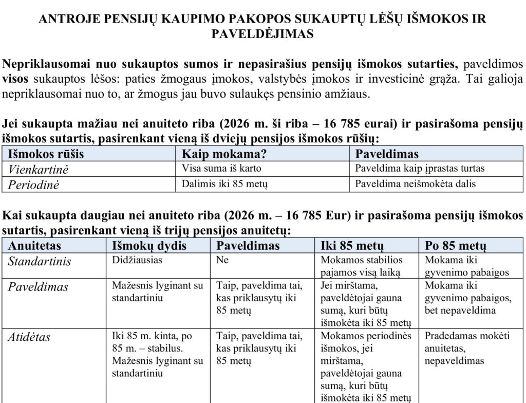 Pasirinkus paveldimą anuitetą, mokamos mažesnės išmokos nei pasirinkus standartinį anuitetą visą žmogaus gyvenimą, tačiau jam mirus iki 85 metų amžiaus (dėmesio – iki 2026 metų buvo 80 metų) jo paveldėtojams išmokama likusi iki šio amžiaus suma.