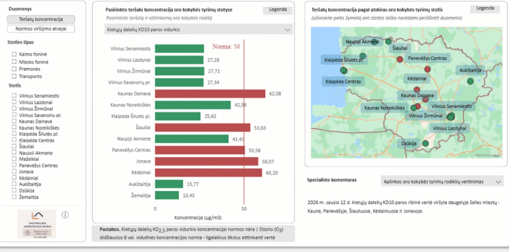 AAA prognozuoja, kad sausio 14-15 dienomis šalyje aplinkos oro užterštumas kietosiomis dalelėmis taip pat gali būti padidėjęs –  išlieka KD10 paros ribinės vertės viršijimo tikimybė. Kietųjų dalelių KD10 paros ribinės vertės skirtingose Lietuvos vietovėse viršijamos jau keletų dienų iš eilės.