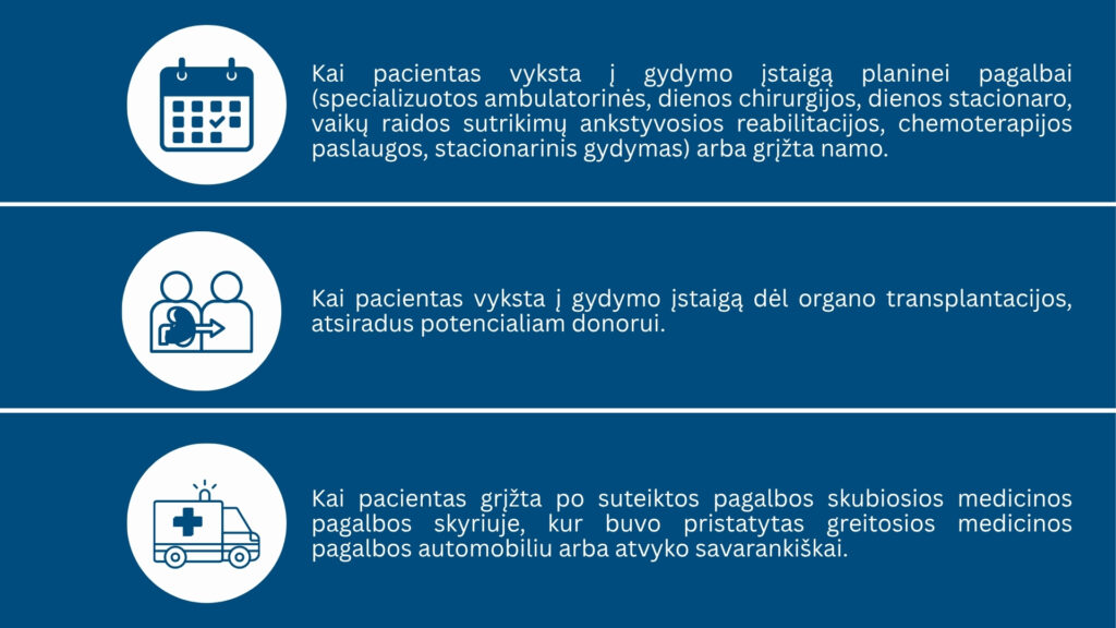 Nuo lapkričio 1 d. dėl pavėžėjimo paslaugų galės kreiptis pacientai, kurie dėl savo sveikatos būklės ar dėl socialinių ir ekonominių priežasčių negali naudotis nei individualiu, nei viešuoju transportu, arba reikiamu metu nėra teikiamos viešojo transporto paslaugos. Pavėžėjimo paslauga gali būti teikiama šiais atvejais: