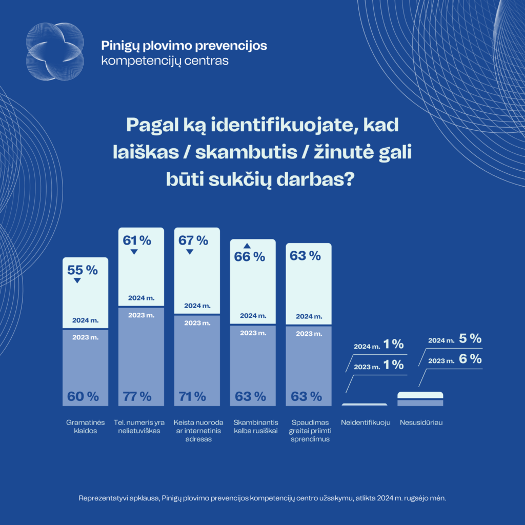 Gramatines klaidas žinutėse ar laiškuose 2023 m. pastebėdavo 60 proc. apklaustųjų, o 2024 m. – 55 proc., arba 5 proc. punktais mažiau. Tokius rezultatus lemia pačių sukčių įgūdžiai: tobulėja klastojamų el. laiškų ar žinučių tekstai, pasitelkiami tikslesni vertimai. Nors juose klaidų – vis dar pasitaiko, gyventojams jas pastebėti prireikia didesnio dėmesio ir susikaupimo.