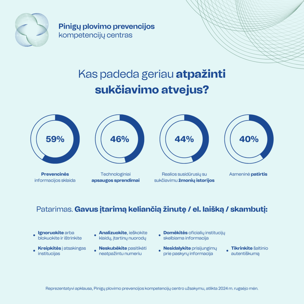 „Finansų įstaigų, policijos, valstybės ir kitų institucijų pateikiama viešoji informacija vis dar išlieka pagrindine pagalbos apsisaugant nuo finansinių sukčių priemone. Tik bendradarbiaudami ir žengdami koja kojon su teisėsaugos institucijomis, verslo sektoriaus atstovais ir visuomene, galėsime efektyviai užkardyti finansinį sukčiavimą ir apsaugoti žmones nuo apgavysčių“, – tvirtina Pinigų plovimo prevencijos kompetencijų centro direktorė E. Lukošienė.