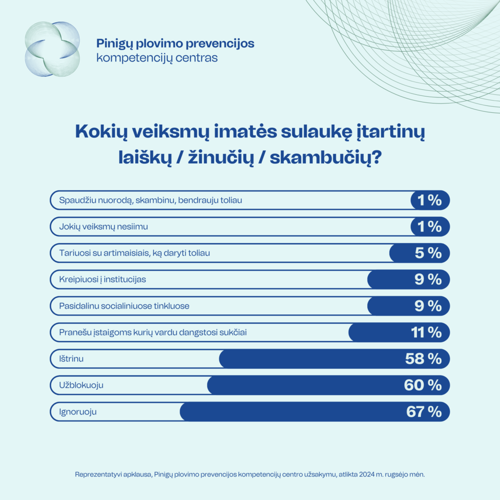 Pinigų plovimo prevencijos kompetencijų centro ekspertai įžvelgia ir kitą nerimą keliančią tendenciją: sulaukę įtartinų skambučių, laiškų ar žinučių, gyventojai rečiau imasi veiksmų. Tyrimo rezultatai atskleidžia, kad pastebimai sumažėjo ištrinančių įtartinus laiškus ir žinutes ar tiesiog juos ignoruojančių respondentų dalis: jei pernai atitinkamai besielgiančiųjų buvo 66 proc. ir 74 proc., šiemet – tik 58 proc. ir 67 proc.