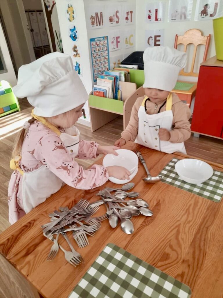 Mokome vaikus atsinešti maistą iš virtuvėlės, pasidengti ir serviruoti stalus, patiems įsidėti patiekalus, valgant mandagiai bendrauti su draugu, kultūringai elgtis su maistu, t. y. suvalgyti viską.