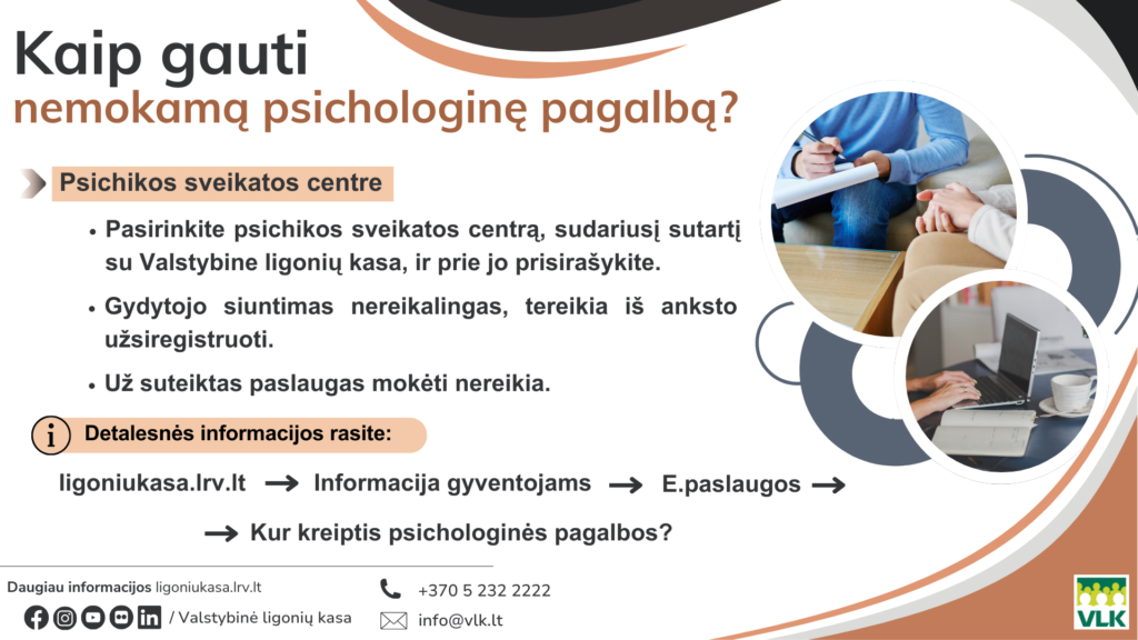 Ligonių kasa primena, kad skubią psichologinę ar psichiatrinę pagalbą psichikos sveikatos centruose galima gauti be eilės. Psichikos sveikatos centrų ne darbo laiku pagalbos galima kreiptis nemokamais telefono numeriais, internetu ar pasirinktose gydymo įstaigose. Informacija apie tai skelbiama: