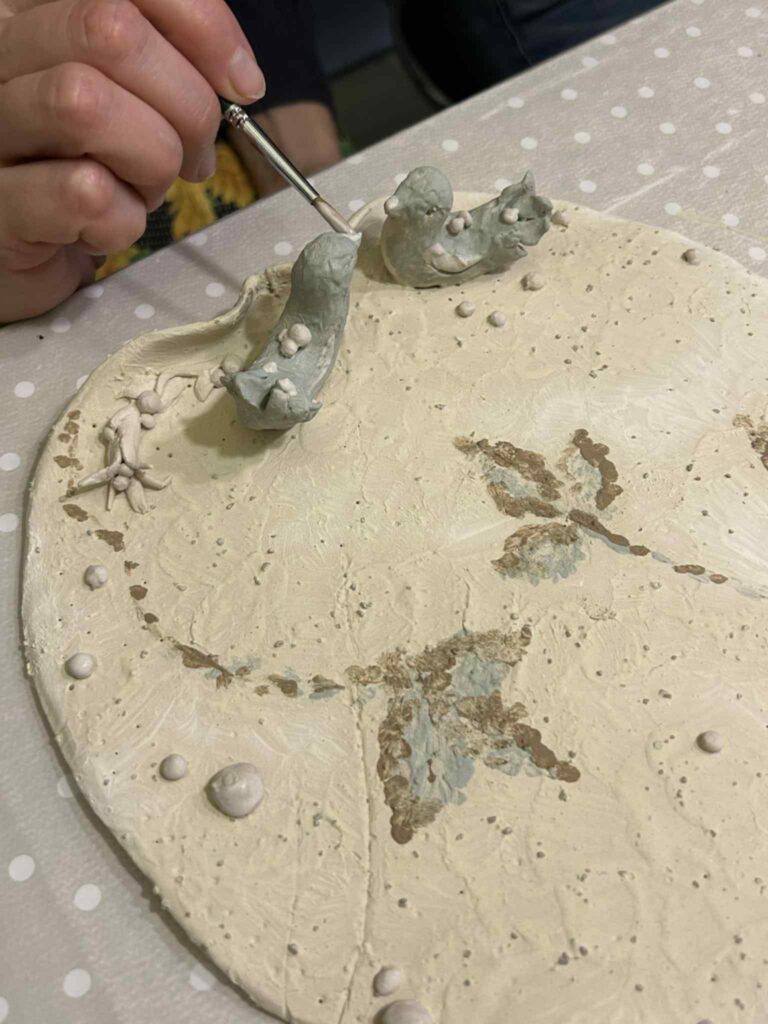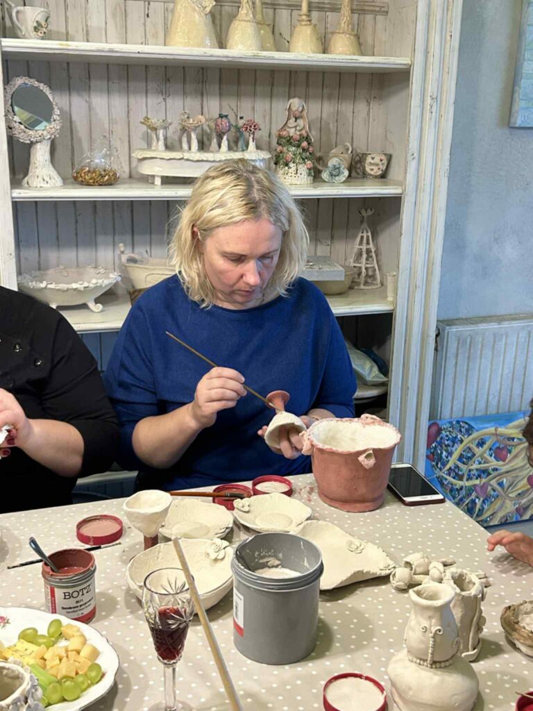 Kadangi molio dirbinių buvo nemažai, moterys nutarė glazūravimo darbus atlikti Jurgitos dirbtuvėje, kur – visos reikiamos priemonės. Susirinkusios gėrėjosi keramikės darbų spalvomis ir mėgino jas atkartoti savo kūriniuose.