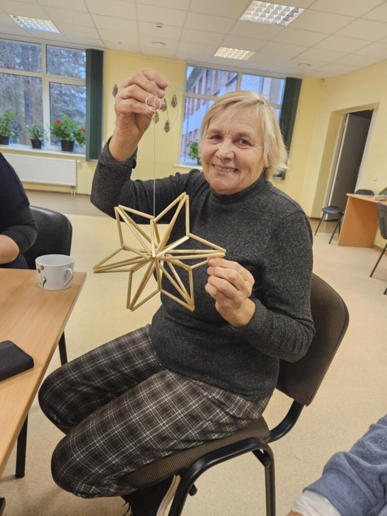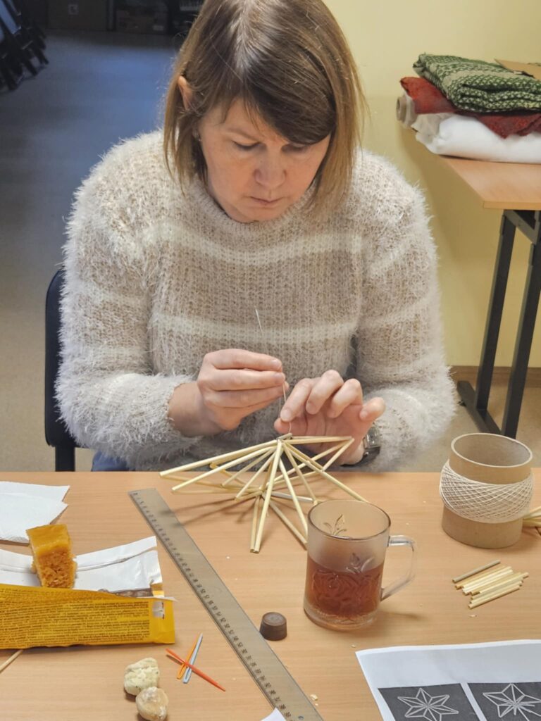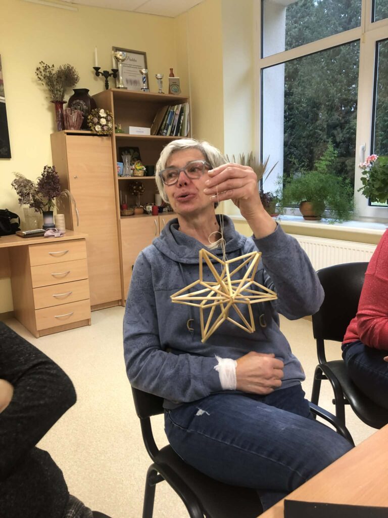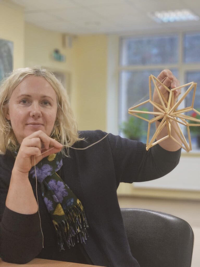 Dalyvės dėkojo Ritai, kuri kantriai aiškino, rodė ir padėjo suverti šiaudelius, kol pirmosios žvaigždės papuošė centro langus.