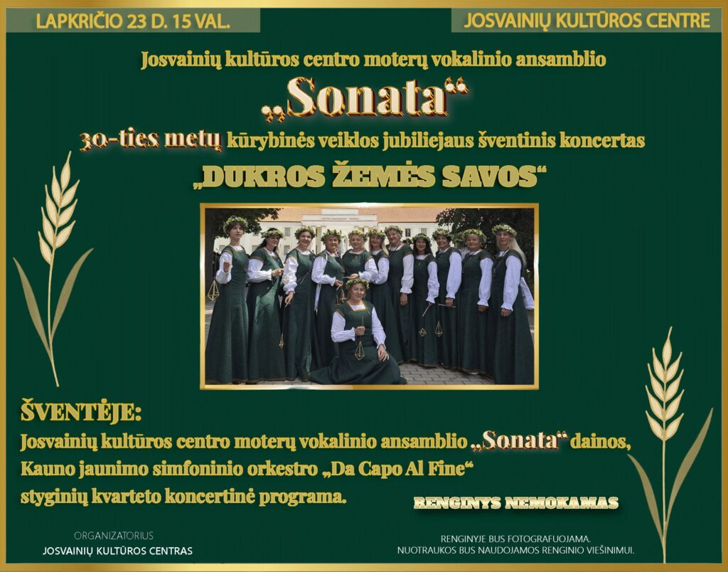O ateinantį sekmadienį kitas Josvainių kultūros centro moterų vokalinis ansamblis – „Sonata” (vadovė Edita Markevičienė) – švęs 30-ties metų kūrybinės veiklos jubiliejų ir kviečia žiūrovus į jubiliejinį koncertą, kuriame skambės gražiausios ansamblio „Sonata” dainos bei Kauno jaunimo simfoninio orkestro „Da Capo Al Fine” styginių kvarteto koncertinė programa. Renginys nemokamas.