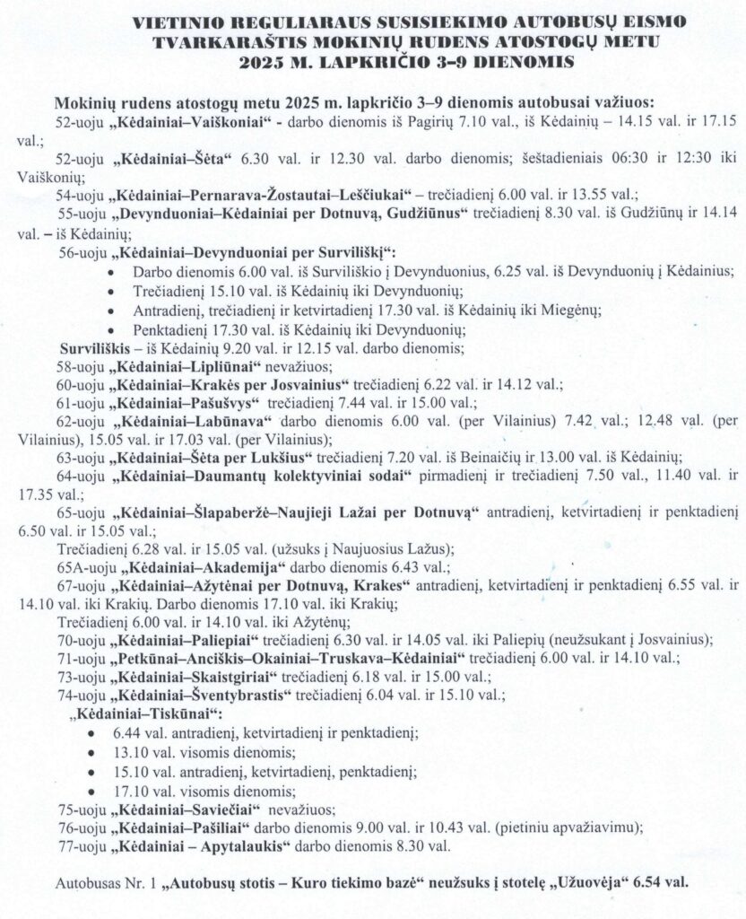 Lapkričio 3-9 dienomis yra moksleivių rudens atostogos. Tuo laikotarpiu sumažės  keleivių srautas, tad UAB ,,Kėdbusas“ praneša, jog yra koreguojamas vietinio reguliaraus susisiekimo autobusų grafikas.