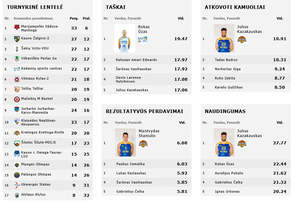 Kėdainių sporto centras: Rokas Ūzas 35 (6/10 trit., 11/13 baud., 8 atk. kam., 4 rez. perd., 44 naud.), Laurynas Danielius 14 (2/7 trit.), Medas Kuprijanovas 11 (5/7 dvit., 10 atk. kam.), Ignas Lukošius 8 (4/7 dvit., 7 atk. kam., 4 blok.), Paulius Semaška 7 (1/7 trit., 7 rez. perd.).