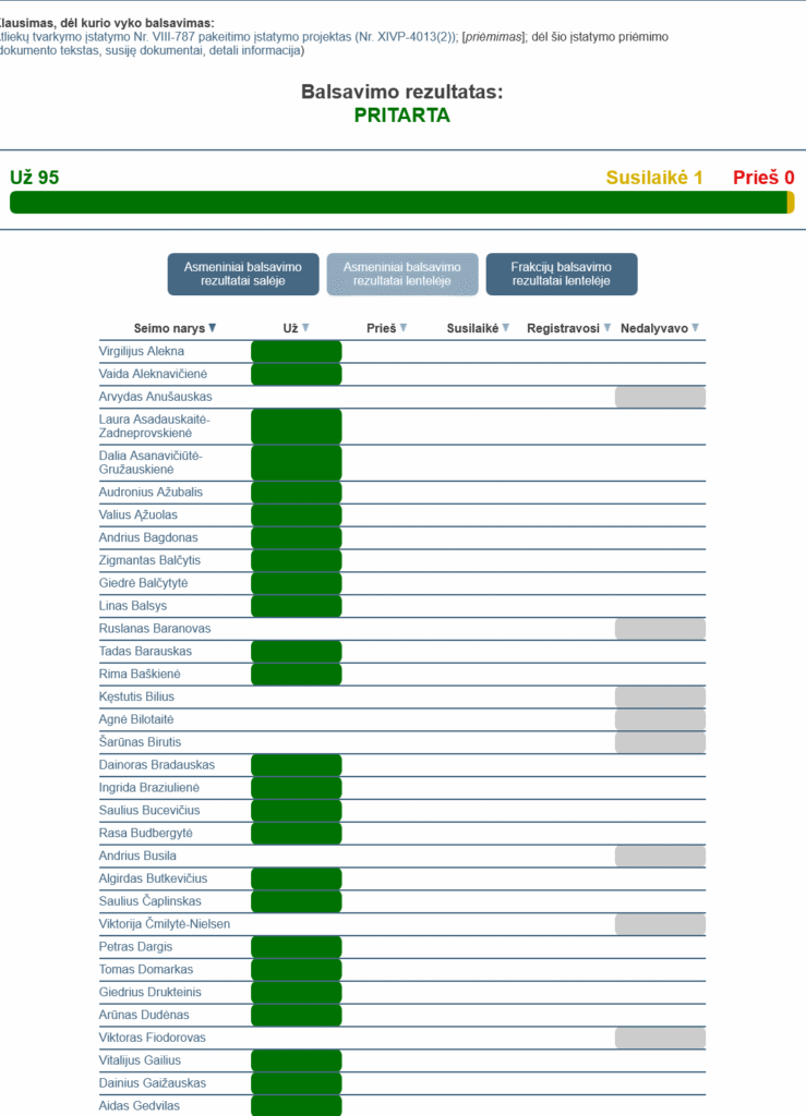 Už tai numatančias Mokesčio už aplinkos teršimą įstatymo pataisas balsavo 95 Seimo nariai, niekas nebuvo prieš, 1 parlamentaras susilaikė. Tačiau Kėdainiuose į LR Seimą išrinktas V. Fiodorovas balsavime nedalyvavo, nors „Lifosos“ poveikis aplinkai ir gyventojų sveikatai – viena iš pagrindinių kėdainiečiams keliančių nerimą aktualijų.