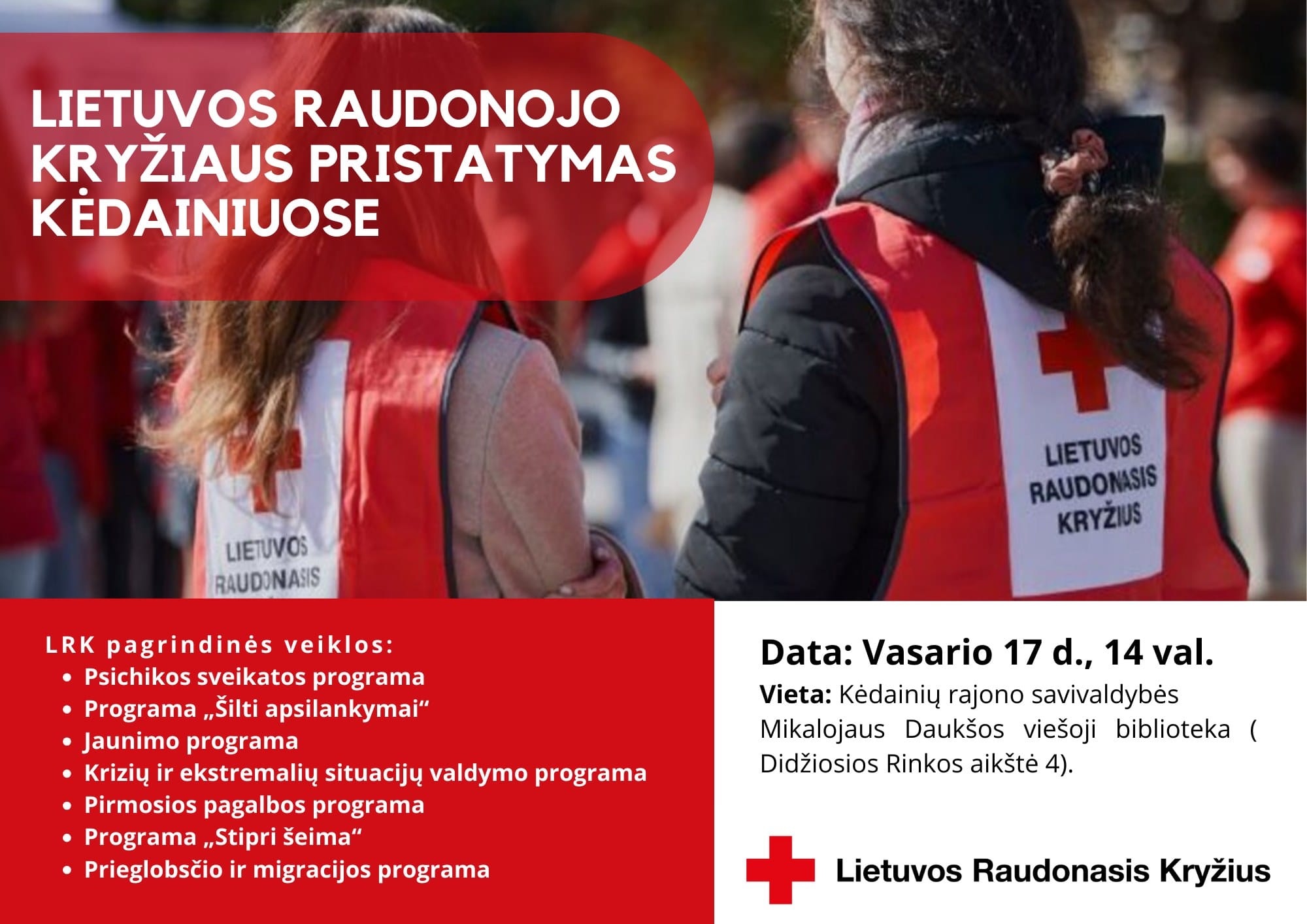 Vasario 17 d. 14 val. M. Daukšos viešosios bibliotekos Vaikų ir jaunimo skyriaus salėje vyks susitikimas su Lietuvos Raudonojo Kryžiaus atstovais. Jie pristatys organizacijos veiklą ir atsakys į Jums rūpinčius klausimus.
