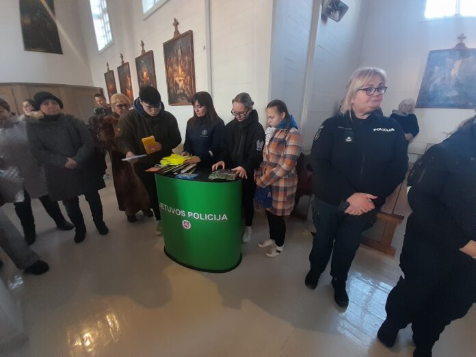 Po mišių žmonės aktyviai domėjosi saugumą didinančiomis priemonėmis, patikusias gavo dovanų. L. Pranckevičiūtės nuotr.