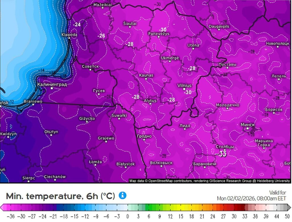 Šį savaitgalį Lietuvą užplūs itin šalti orai – prognozuojama, kad naktį iš šeštadienio į sekmadienį ir naktį iš sekmadienio į pirmadienį vietomis gali būti fiksuojamas speigas (-30 °C). Didžiausia to tikimybė tikėtina pirmadienį anksti ryte.