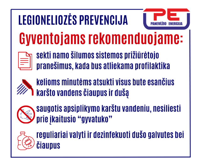 „Vartotojai turėtų sekti namo šilumos sistemos prižiūrėtojo pranešimus, kada bus atliekama profilaktika. Labai svarbu, kad jos metu gyventojai kelioms minutėms atsuktų visus karšto vandens čiaupus, įskaitant ir dušą, ir leistų vandeniui nubėgti – taip bus užtikrintas bakterijų sunaikinimas jūsų namuose“, – sako R. Kerežis.
