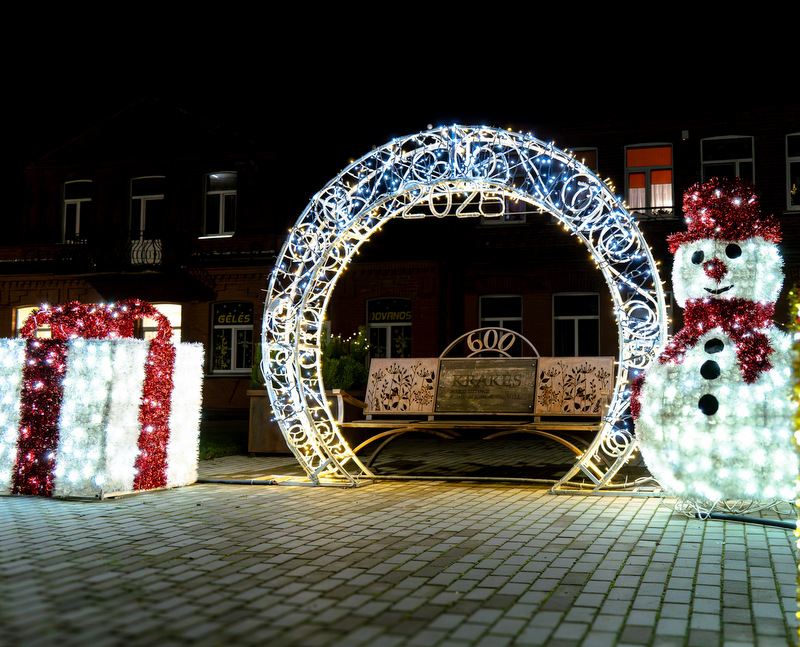Eglutę puošė Krakių seniūnija, o seniūnas šiais metais ypatingą dėmesį skyrė ir alėjai – ji papuošta geltonomis šviečiančiomis girliandomis. Šventiškai nušvitęs miestelis tarsi kviečia į artėjančių švenčių laukimą.