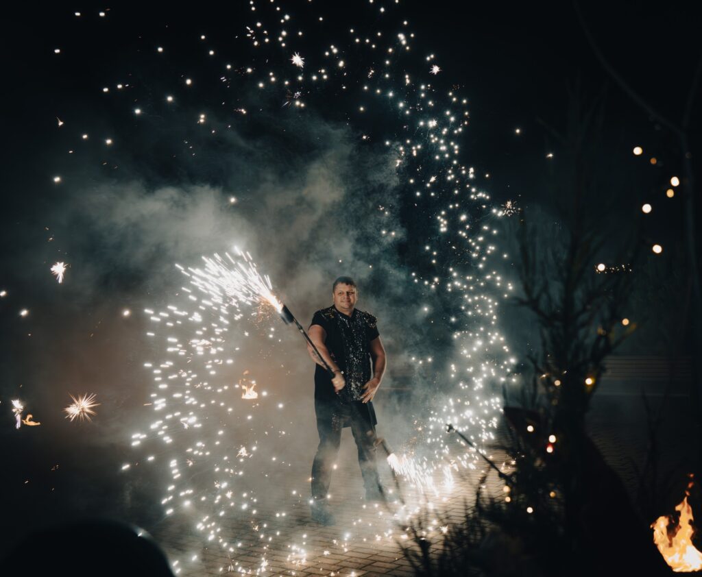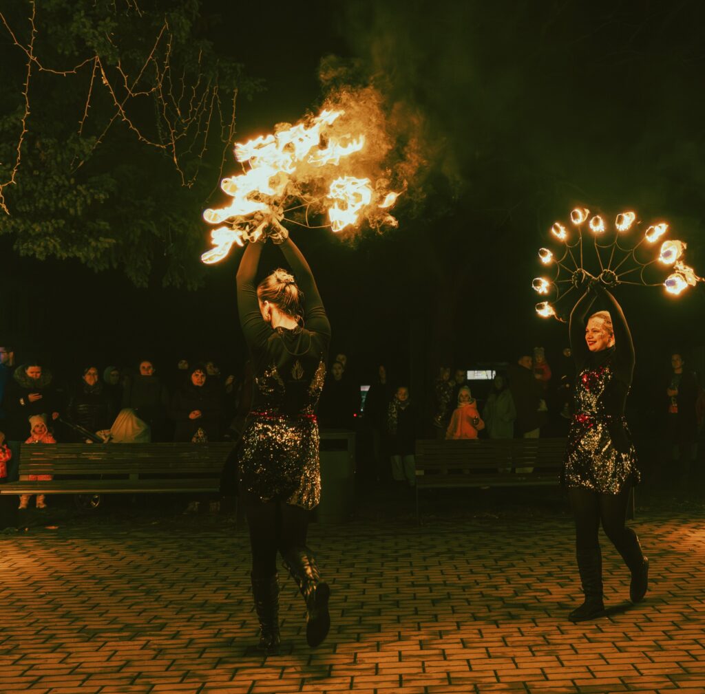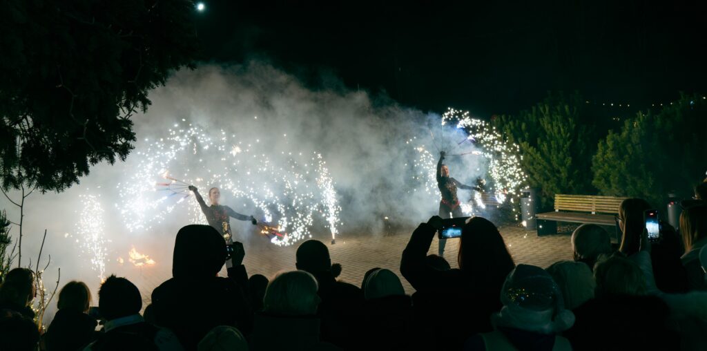 Vėliau visi išėjo į lauką, kur laukė pagrindinis šventės akcentas. Čia vyko efektingas ugnies šokis su įvairiais ugnies elementais, o kulminacija tapo Kalėdų eglutės įžiebimas.