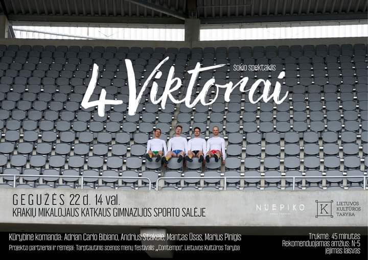 Tad „4 Viktorai“ – tai ne tik anonimiška ir abstrakti sporto fenomeno interpretacija per šokį ir cirką, bet tuo pačiu priminimas visiems mums, jog kūrybiškumo ir žaismės dėka kiekvienas galime išskleisti savo unikalų potencialą. Jog esame nugalėtojai. Viktorai“, – apie šiandien krakiškiams pristatomą spektaklį pasakoja jo kūrėjai.