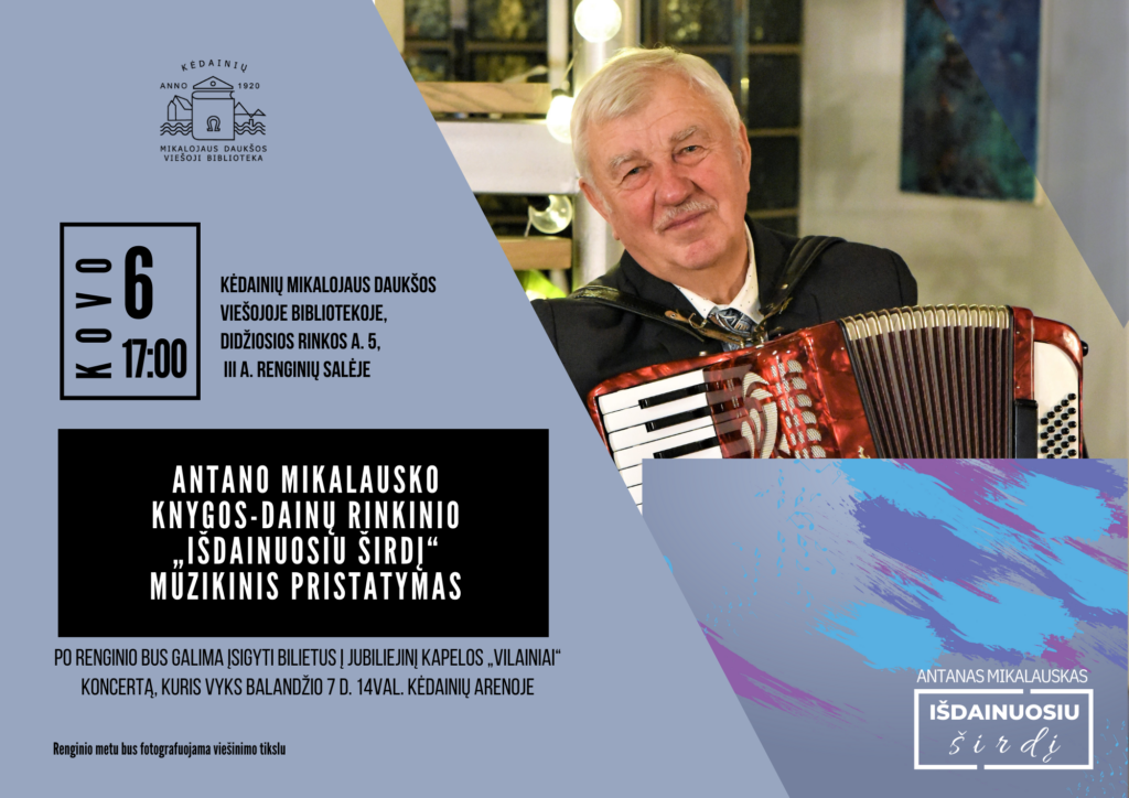 Šiandien, kovo 6 d. 17 val. M. Daukšos viešojoje bibliotekoje, Didžiosios Rinkos a. 5, III a. renginių salėje vyks Antano Mikalausko knygos-dainų rinkinio „Išdainuosiu širdį“ muzikinis pristatymas.