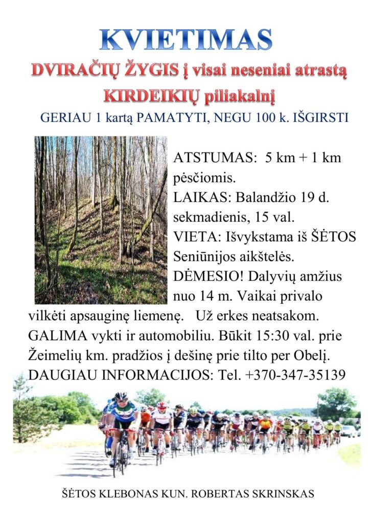 Šėtos klebonas kun. Robertas Skrinskas ieškodamas buvusių Kirdeikių kapinaičių nufilmavo, sumontavo ir ieškodamas daugiau medžiagos atrado, kad čia būta piliakalnio. Sekmadienį, balandžio 19 d., jis organizuoja dviračių žygį į neseniai atrastą vietą.