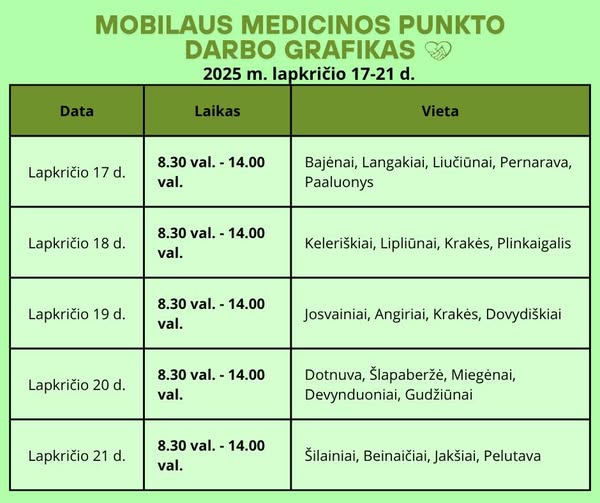 Dėl iškvietimų į pacientų namus, galite skambinti slaugos paslaugų namuose koordinatorei Raimondai Pučėtienei telefonu 0-662-20021.