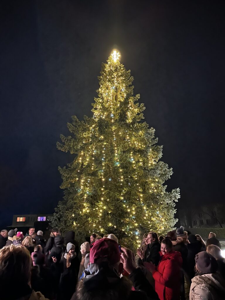 Papuošta girliandomis, iš toli žėri Labūnavos Kalėdų eglutė, o prie susirinkę labūnaviškiai smagiai leido laiką eglutės įžiebimo šventėje.