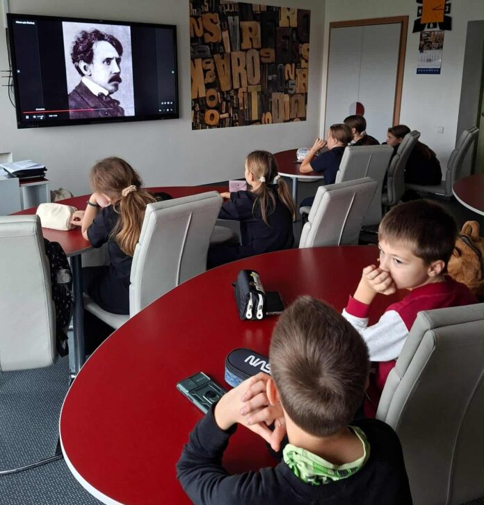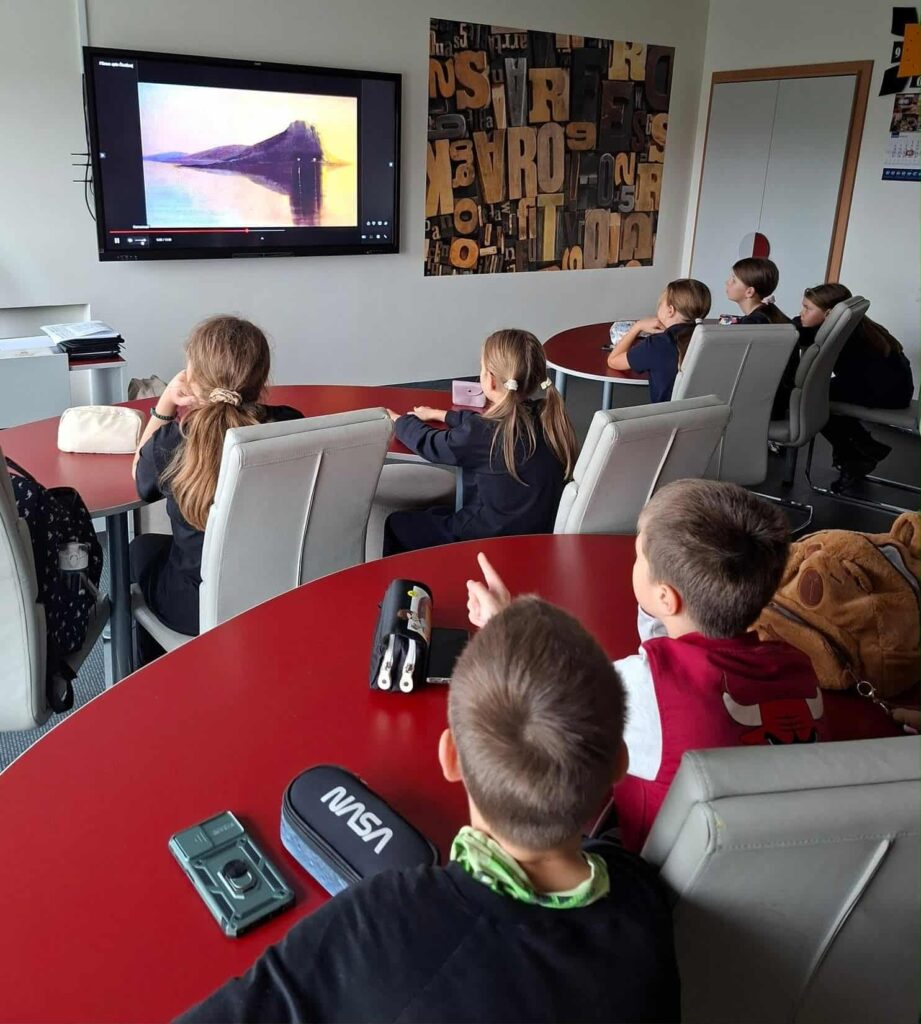 „Išmaniųjų akademijos“ mokiniai su mokytoja Agne Saliene žiūrėjo vaizdo įrašą apie M. K. Čiurlionį ir atliko kūrybinę užduotį, siekdami geriau pažinti menininko pasaulį.