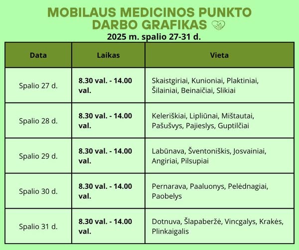 Dėl iškvietimų į pacientų namus, galite skambinti slaugos paslaugų namuose koordinatorei Raimondai Pučėtienei telefonu 0-662-20021.
