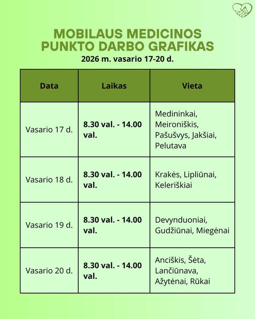 Dėl iškvietimų į pacientų namus, galite skambinti slaugos paslaugų namuose koordinatorei Raimondai Pučėtienei telefonu 0-662-20021.