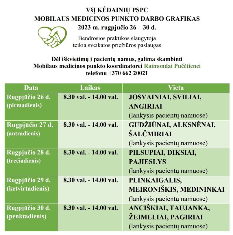 PradžiaKraštiečiams aktualuMobilus medicinos punktas pas rajono gyventojus kitą savaitę važiuos tokiu grafikuKraštiečiams aktualuPravartu žinotiMobilus medicinos punktas pas rajono gyventojus kitą savaitę važiuos tokiu grafiku Kėdainių mugės inf.-2024/08/25FacebookEmail KITOS NAUJIENOS Būkime sveikiGydytojas paaiškino, kada mineralinis vanduo gydo, o kada kenkia – svarbu nepadaryti vienos klaidos Pravartu žinotiSukčiai iš vyro išviliojo daugiau nei 130 tūkst. eurų LaisvalaikisKur eiti?.. (Renginiai Kėdainių mieste ir rajone) Taip pat skaitykite