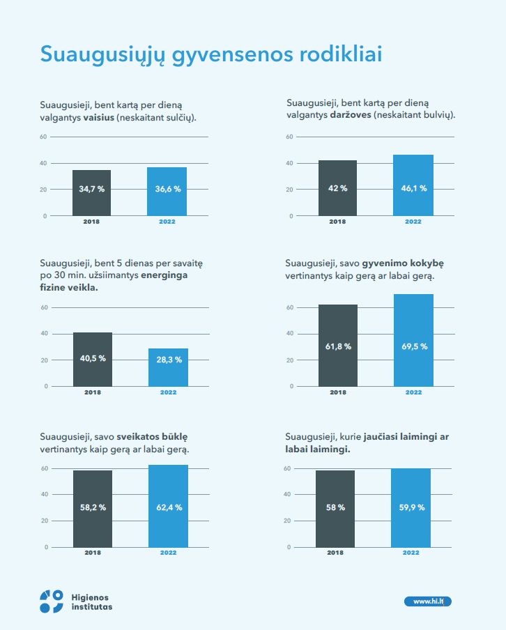 Vertinant suaugusiųjų mitybos įpročius, pastebima teigiama tendencija – didėja vaisių ir daržovių vartojimo dažnumas, tačiau kartu fiksuojamas fizinio aktyvumo mažėjimas: 2022 m. energinga fizine veikla bent po 30 minučių penkias ir daugiau dienų per savaitę užsiėmė 12,2 proc. mažiau apklaustųjų nei anksčiau.