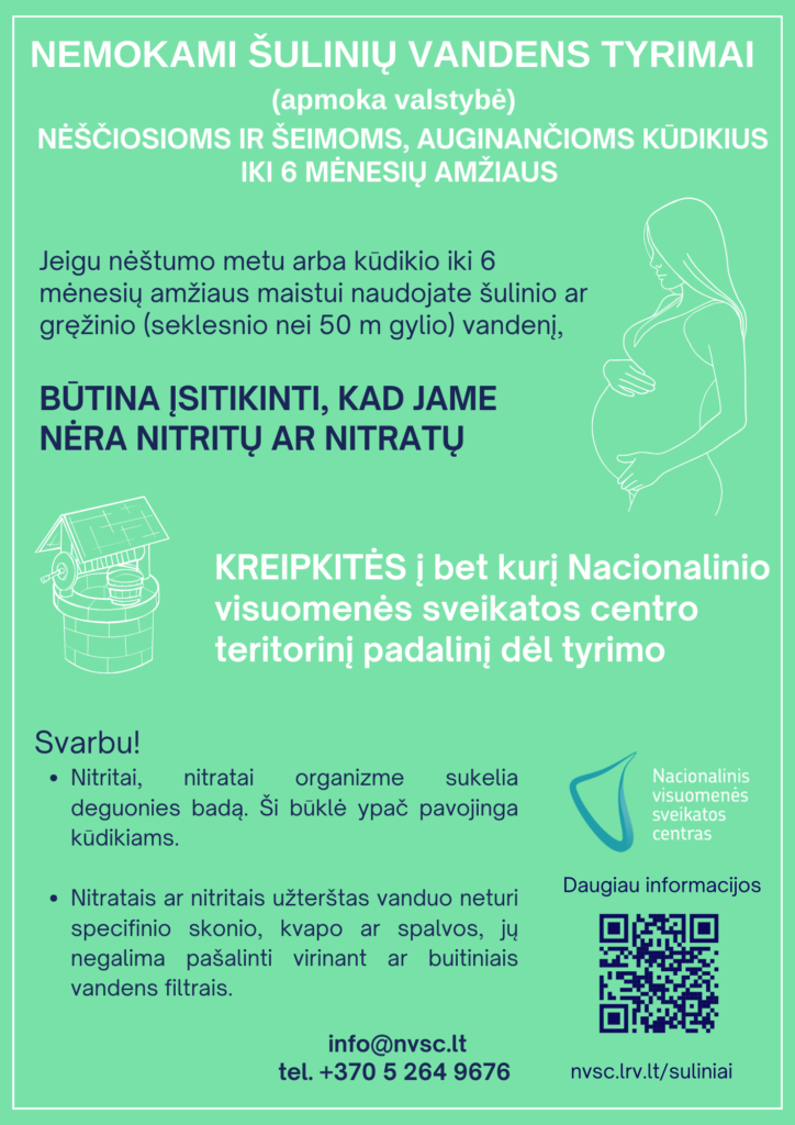 Nėščiosioms ir šeimoms, auginančioms kūdikius iki 6 mėn. amžiaus, kurių maistui naudojamas vanduo iš individualaus šachtinio šulinio ar seklesnio negu 50 m gylio gręžinio, vandens tyrimai nitritų ir nitratų kiekiui nustatyti atliekami valstybės lėšomis.