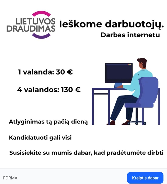 Pastaruoju metu socialiniuose tinkluose fiksuojama informacija, neva didžiausias šalies draudikas „Lietuvos draudimas“ siūlo darbą internetu, mokėdamas valandinius įkainius.
