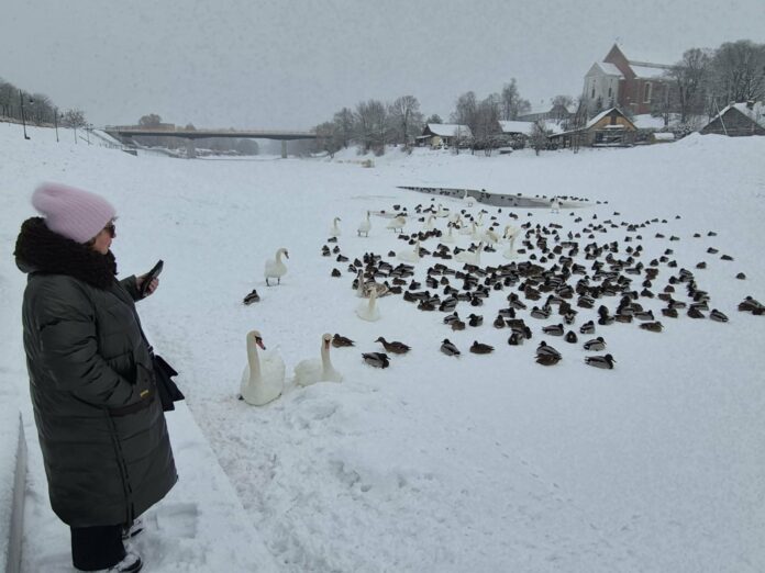 Tad kėdainiečiams tenka rūpintis Nevėžyje, ties pėsčiųjų tiltu Kėdainių senamiestyje, likusiomis žiemoti keliasdešimčia ančių ir gulbių.