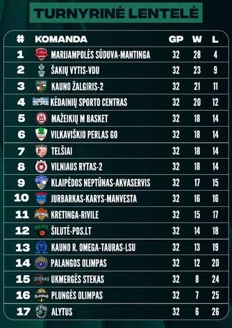 Pirmoji grupė: Marijampolės „Sūduva-Mantinga“ (28-4), Šakių „Vytis-VDU“ (23-9), Kauno „Žalgiris-2“ (21-11), Kėdainių sporto centras (20-12), Mažeikių „M Basket“ (18-14), Vilkaviškio „Perlas Go“ (18-14), „Telšiai“ (18-14) ir Vilniaus „Rytas-2“ (18-14).