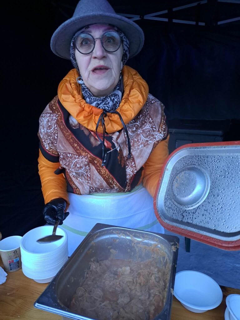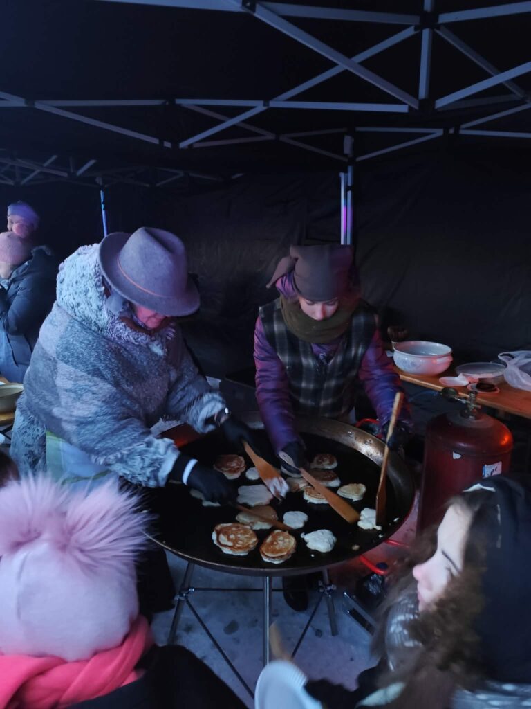 „Esame labai dėkingi Kėdainių sveikos mitybos partneriui, kuris mus maitina ir remia ne viename renginyje. Jie padėjo užmaišyti blynų tešlą, virė šiupinį, o mums beliko blynus išsikepti ir vaišinti žmones. Kultūros centro darbuotojai dalijo vaišes ir vaišino karšta arbata“.