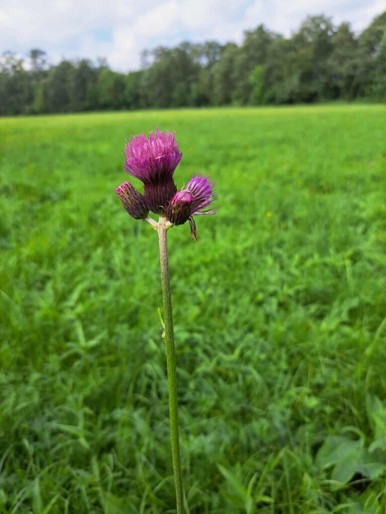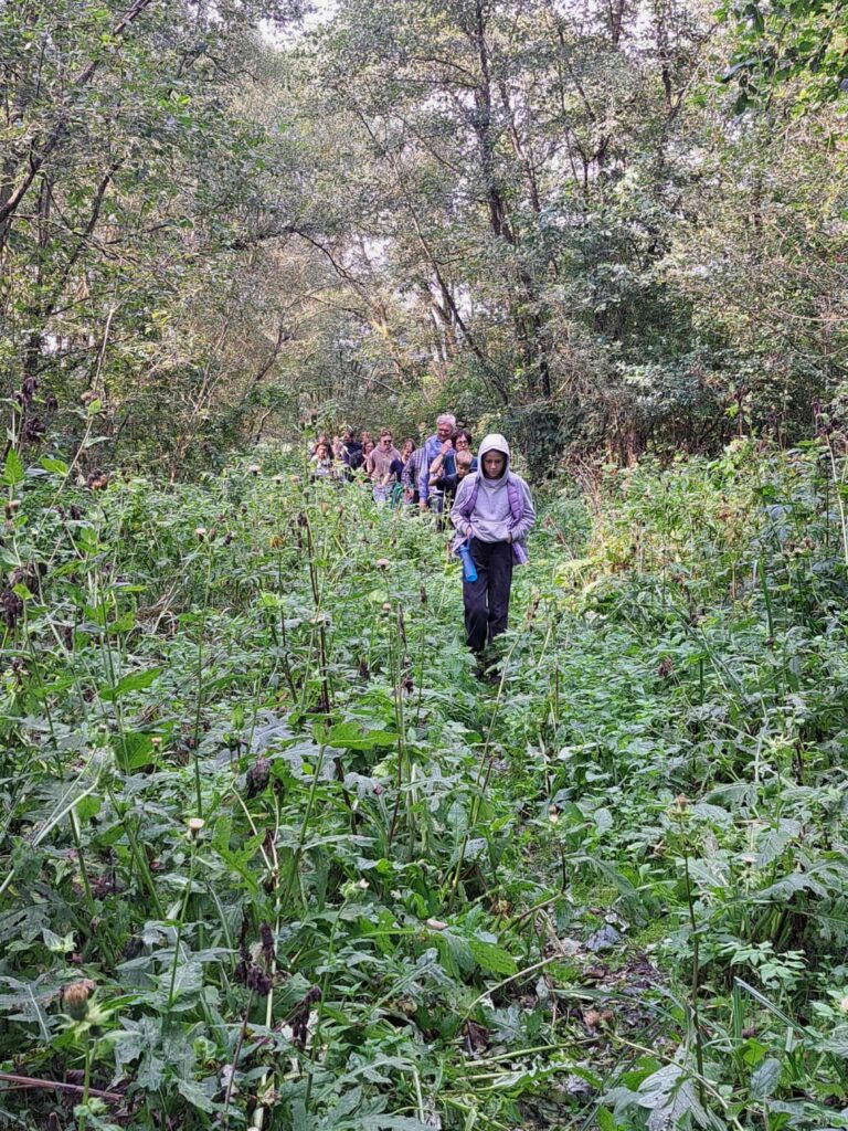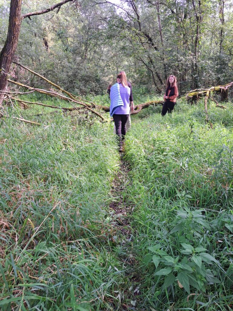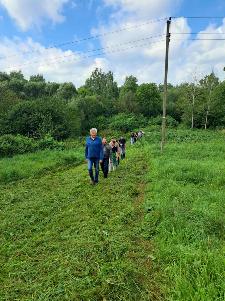 Toliau kelias vinguriavo pro įsėtas ganyklas ir laukines pievas. Dalyviai ėjo apie 2 km per pievas, kirto „šlapynę“, lipdami per nuvirtusį medį, ir pakilo į kalną, iš kur atsivėrė plačios Nevėžio slėnio panoramos. Kiekvienas žingsnis leido pajusti slėnio gyvybingumą – nuo žaliuojančių pievų iki retų augalų ir gyvūnijos įvairovės.