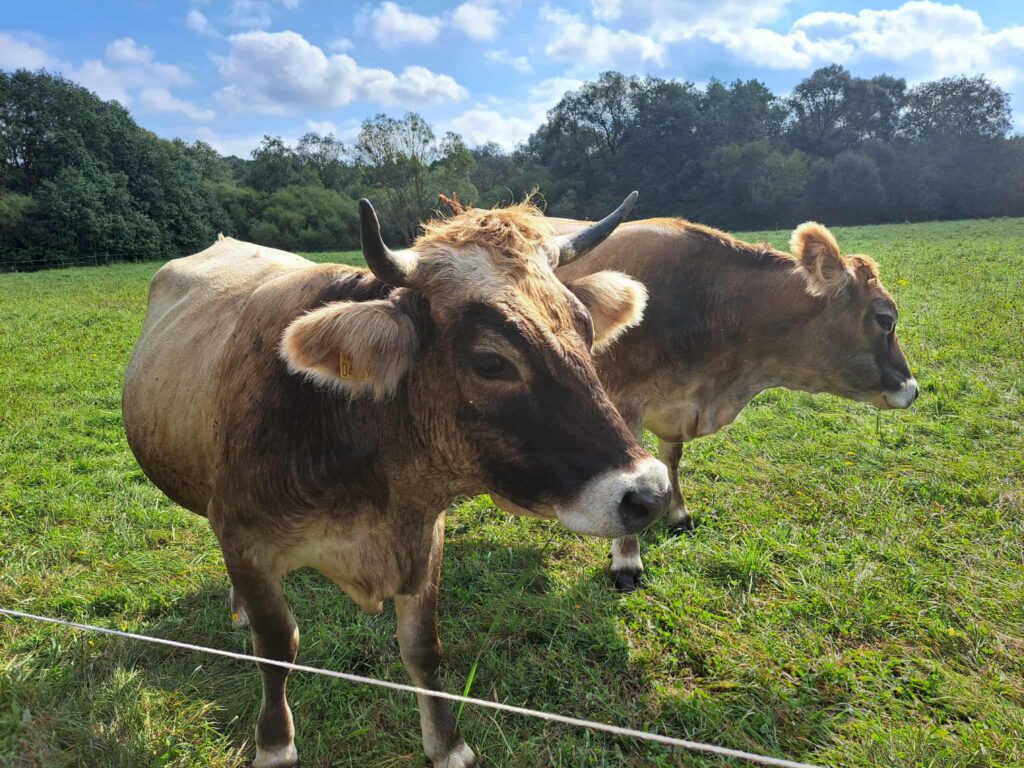 Ūkyje gyvena ir mažiausio aviganio – korgio mišrūnas. Nors išlikę instinktai, bet jis paprastai bando gyvulius atginti pas mus, ne nuo mūsų. Bandos branduolį sudaro prancūziškos aubrakų veislės karvės. Jų tėvynėje šių karvių varpeliai itin svarbūs: pieninėse bandose, ypač kalnuotose vietovėse, rūkas apsunkina matomumą, todėl pagal varpelių garsą karvės orientuojasi ir eina ten, kur veda vedlė.