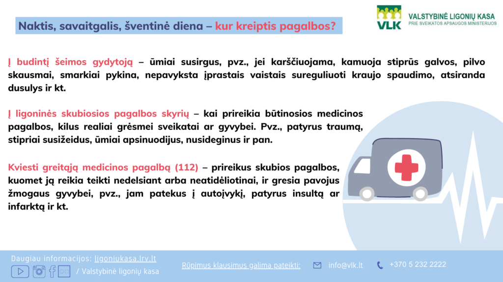 Sutrikus sveikatai įprastomis darbo dienomis ir valandomis žmonės nedvejodami kreipiasi į savo gydymo įstaigą – polikliniką ar šeimos medicinos centrą. Naktį, savaitgalį ar per šventes gyventojai dažnai taip pat nedvejodami vyksta į ligoninių skubiosios pagalbos skyrius. Prieš šventes ligonių kasos primena, kada į ligoninę skubėti vis dėlto nereikia ir kur kreiptis sunegalavus ne darbo dieną.