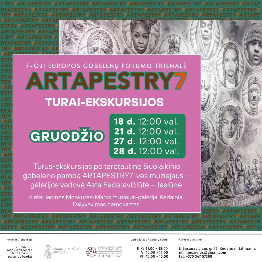 Iki gruodžio 31 d. Janinos Monkutės-Marks muziejuje-galerijoje veikia keliaujanti tarptautinė šiuolaikinio gobeleno paroda „ARTAPESTRY7“. Jei dar nespėjote joje apsilankyti, numatyti jau paskutinieji turai–ekskursijos su muziejaus-galerijos vadove Asta Fedaravičiūte-Jasiūne. Jų metu lankytojai turės galimybę atidžiau susipažinti su parodos eksponatais, išgirsti jų sukūrimo istorijas ir kūrėjų idėjas.