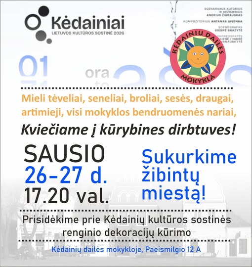 18:30 – 19:30 val. projekto „Kėdainiai – Lietuvos kultūros sostinė 2026” atidarymo renginys „Oratorija AŠIS”.